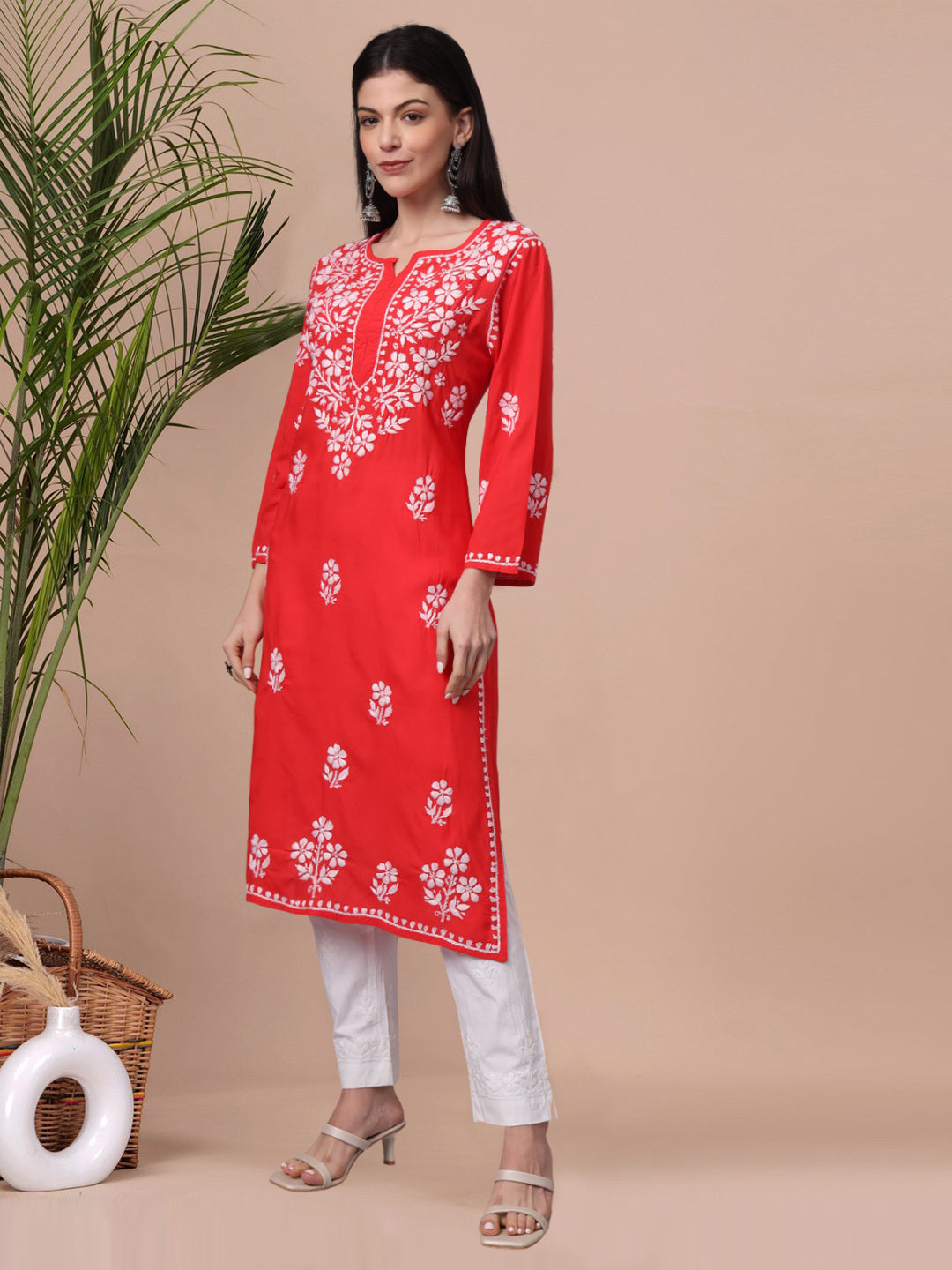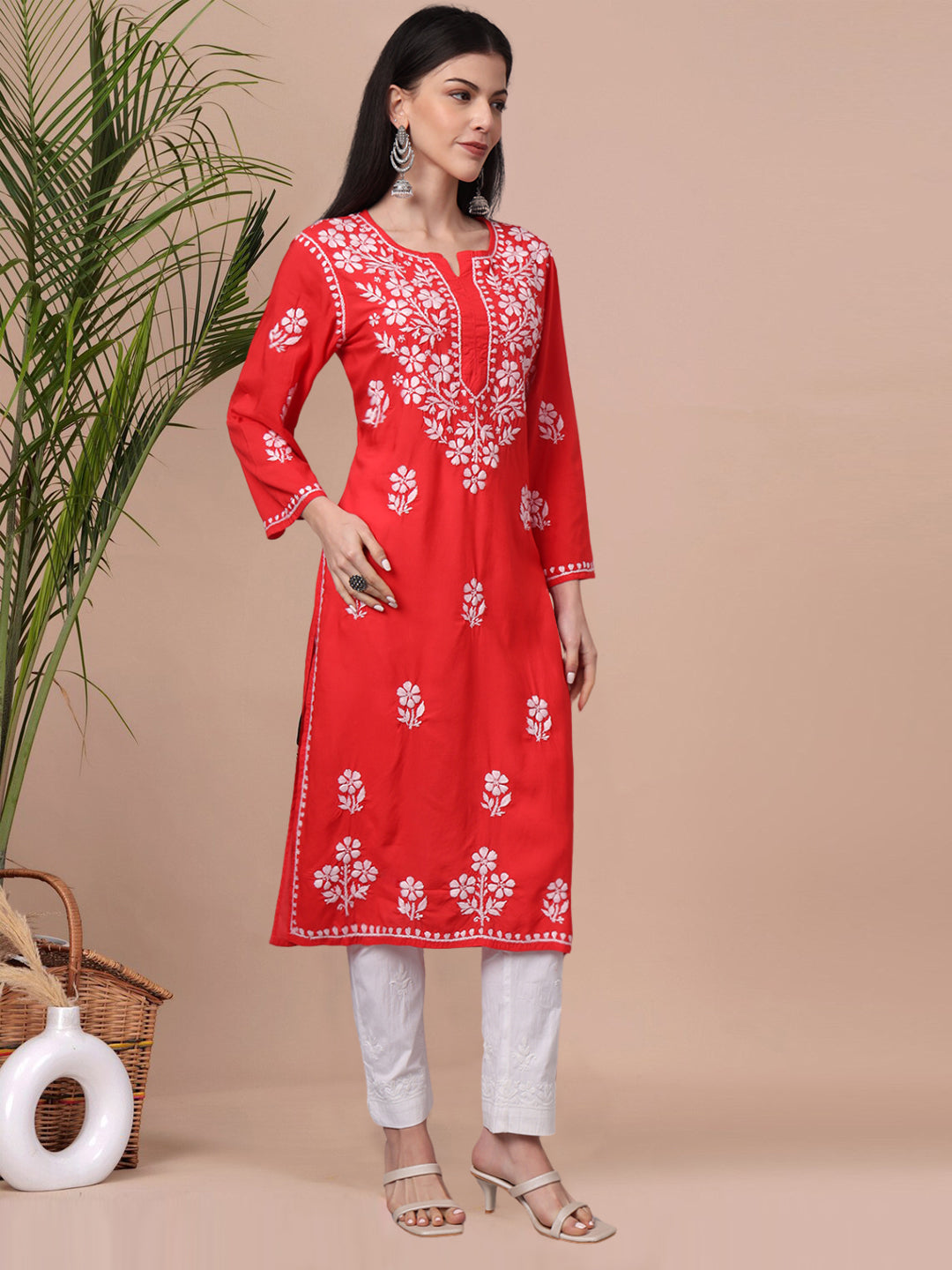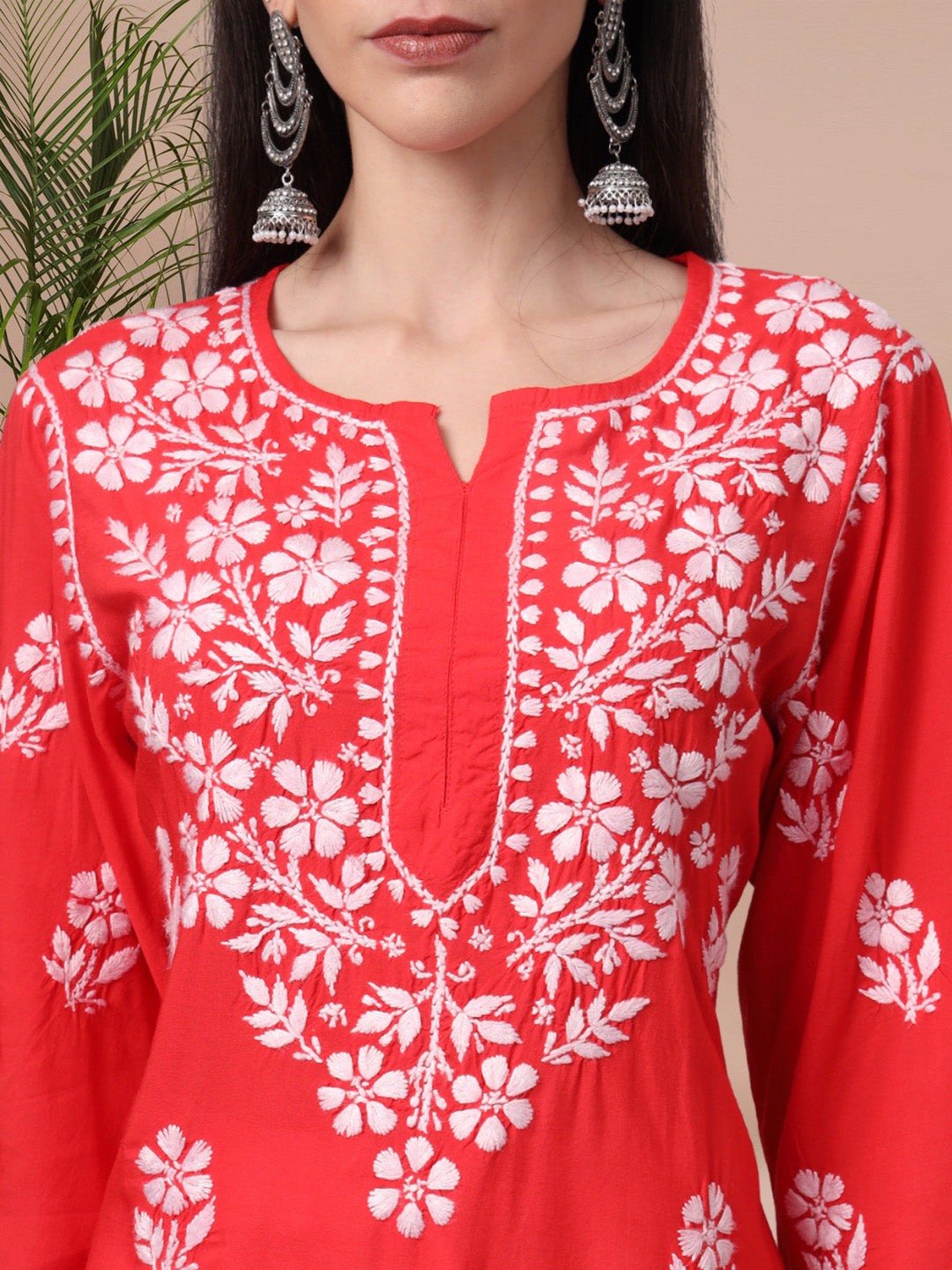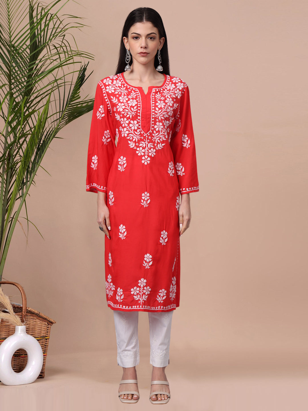 Hand Embroidered Chikankari Modal Kurta- AL4013 Red