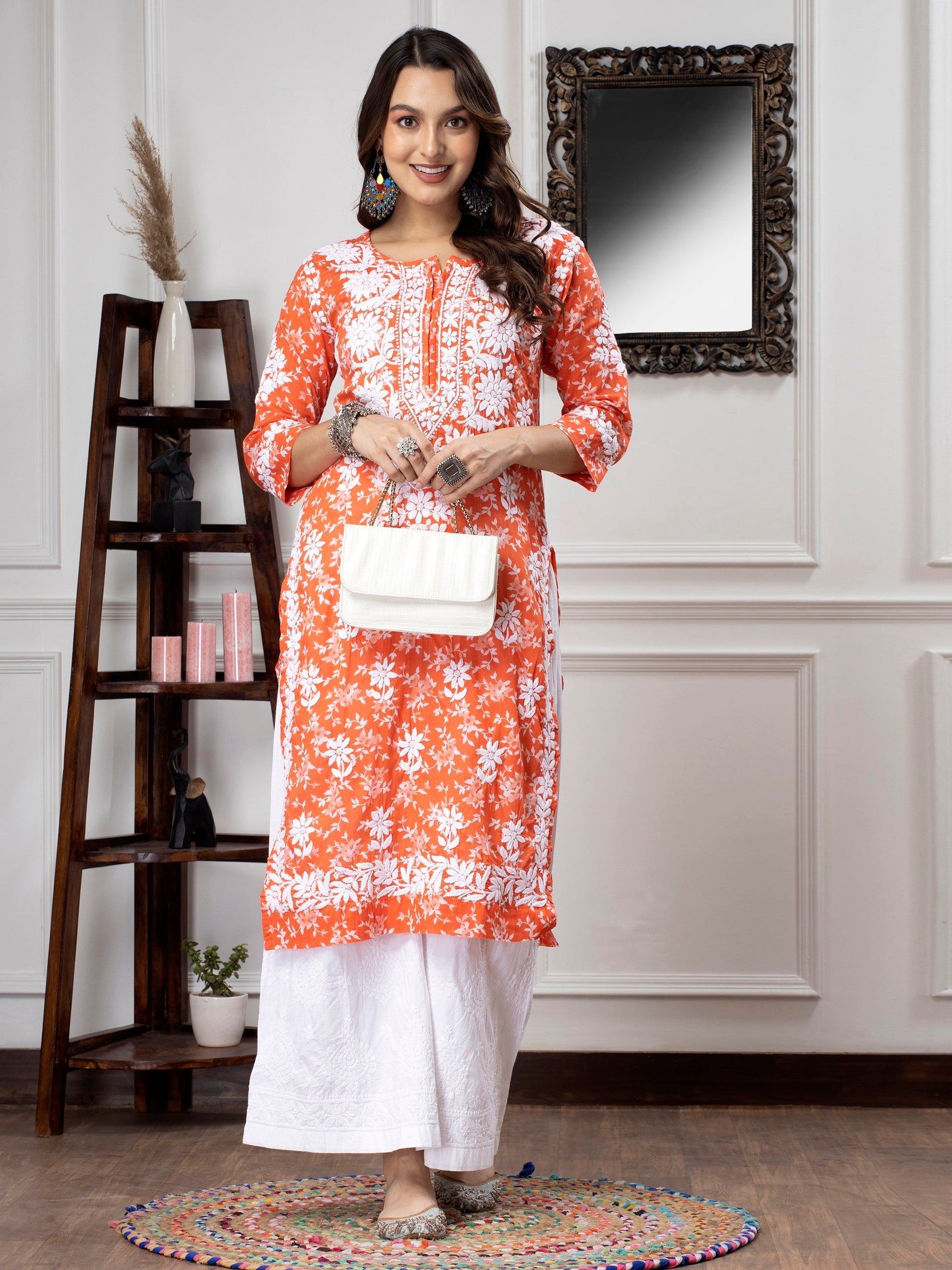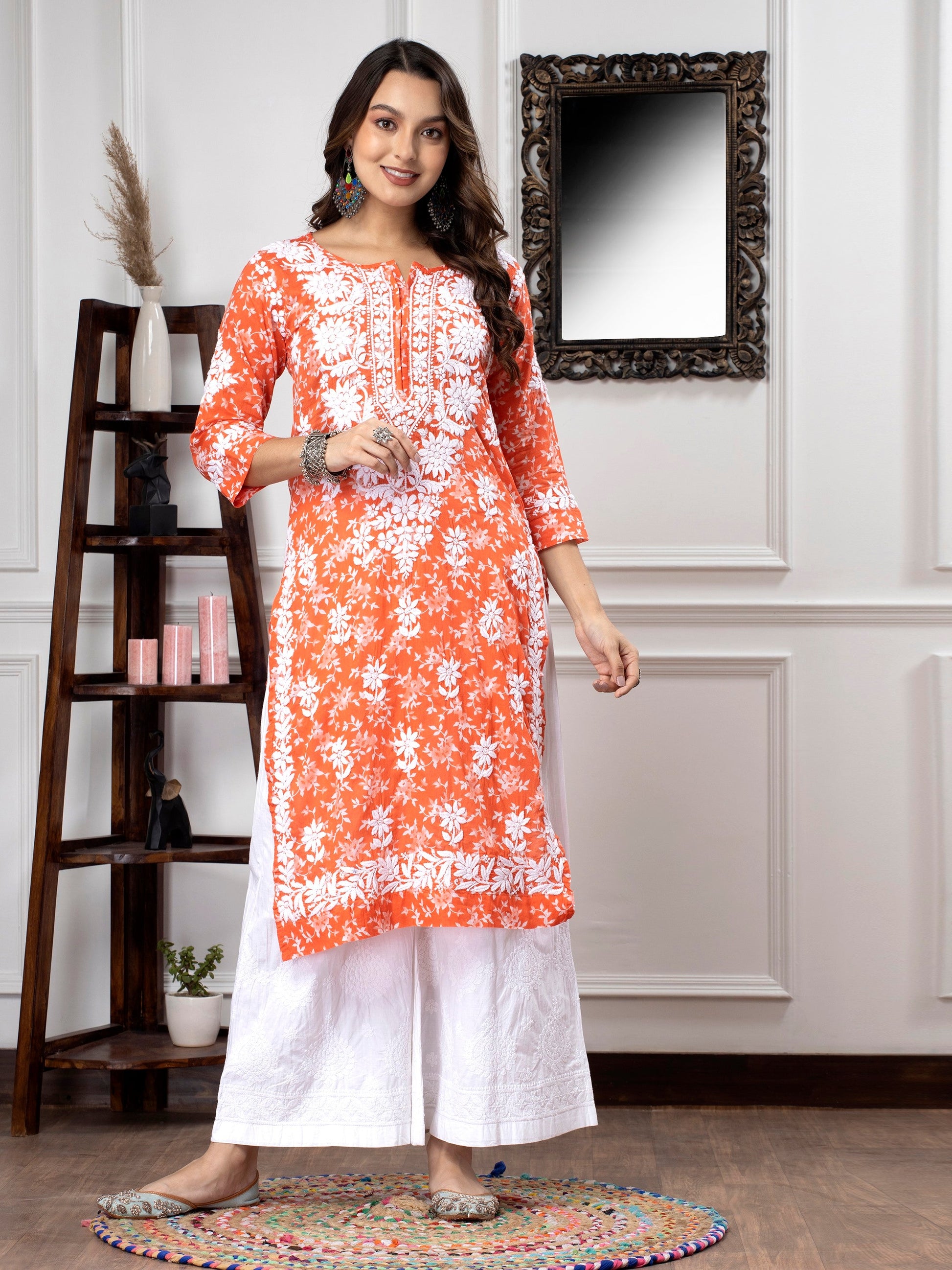 Hand Embroidered Chikankari Mulmul Straight Kurta-AL3648 Orange