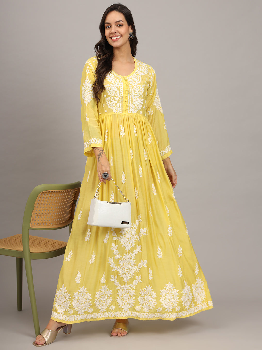 This exquisite Muslin Jalabiya features hand-embroidered Chikankari detailing, offering a delicate and refined look. It has a round neckline and stylish three-quarter sleeves, blending traditional craftsmanship with modern elegance.