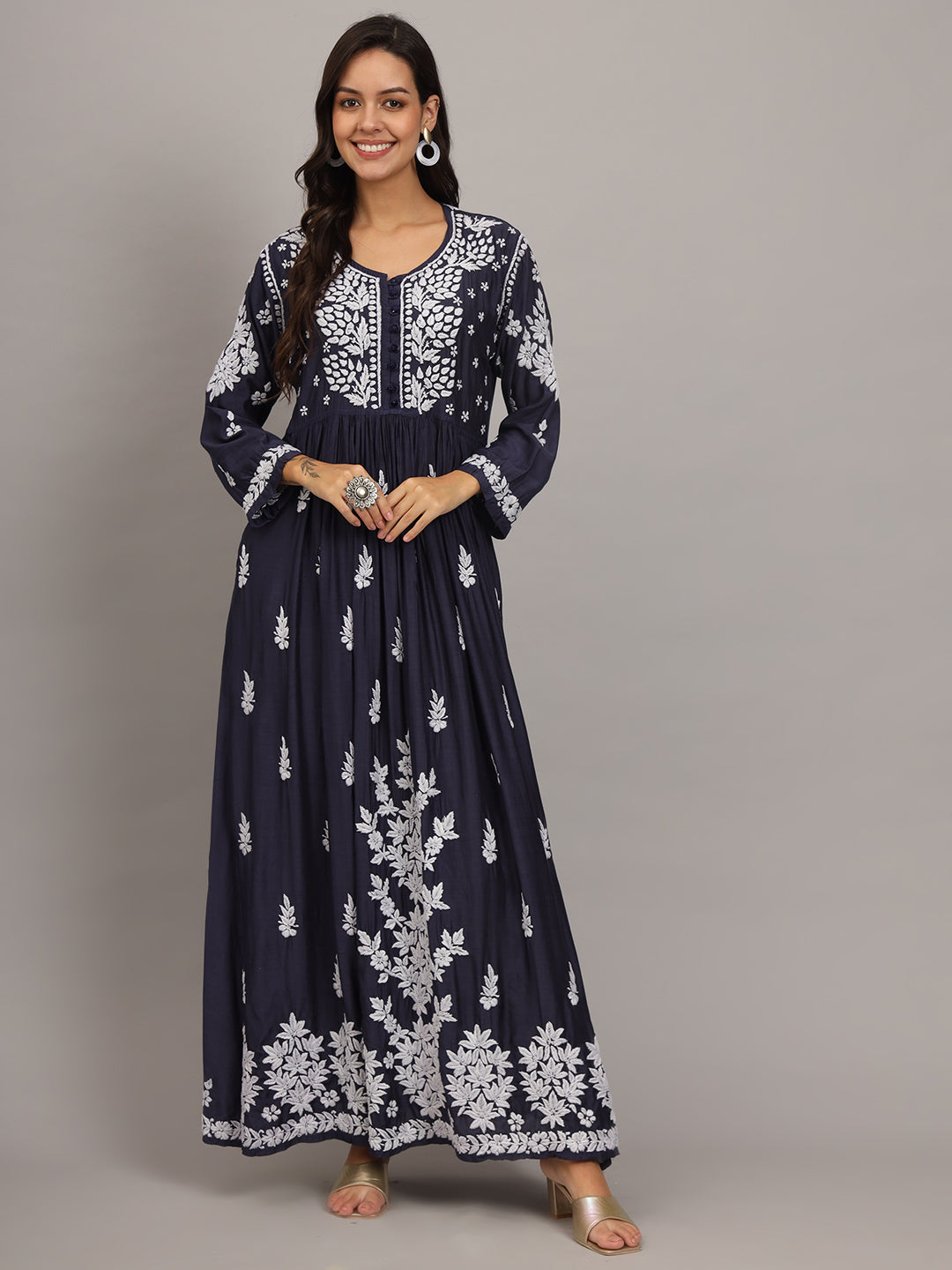 Hand Embroidered Chikankari Muslin Jalabiya-AL4017 Navy