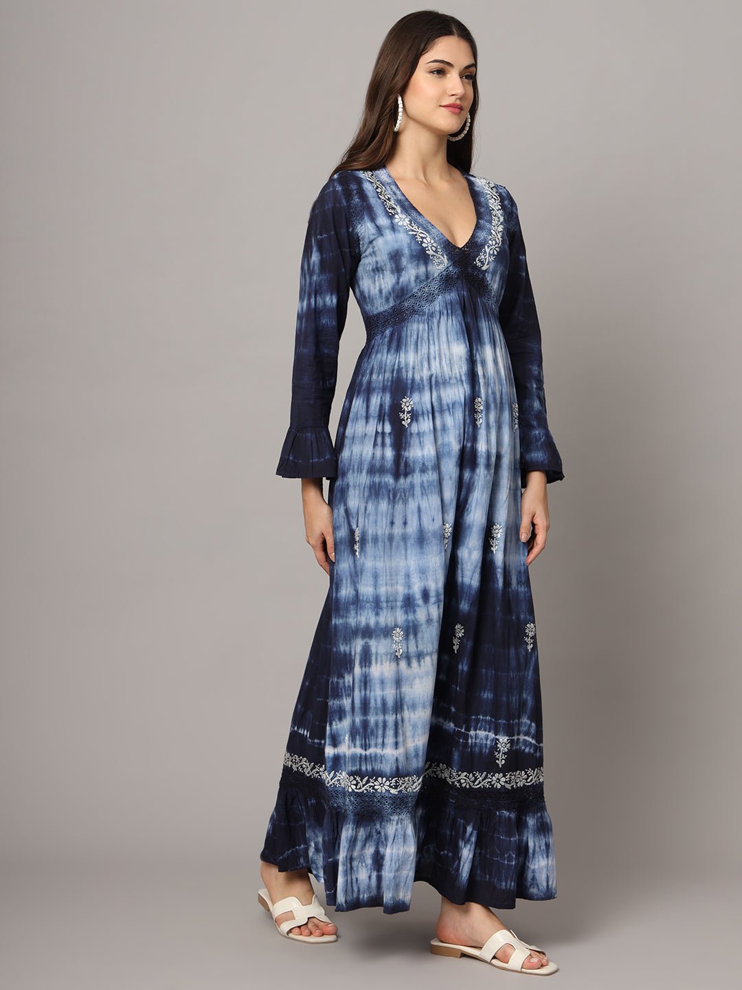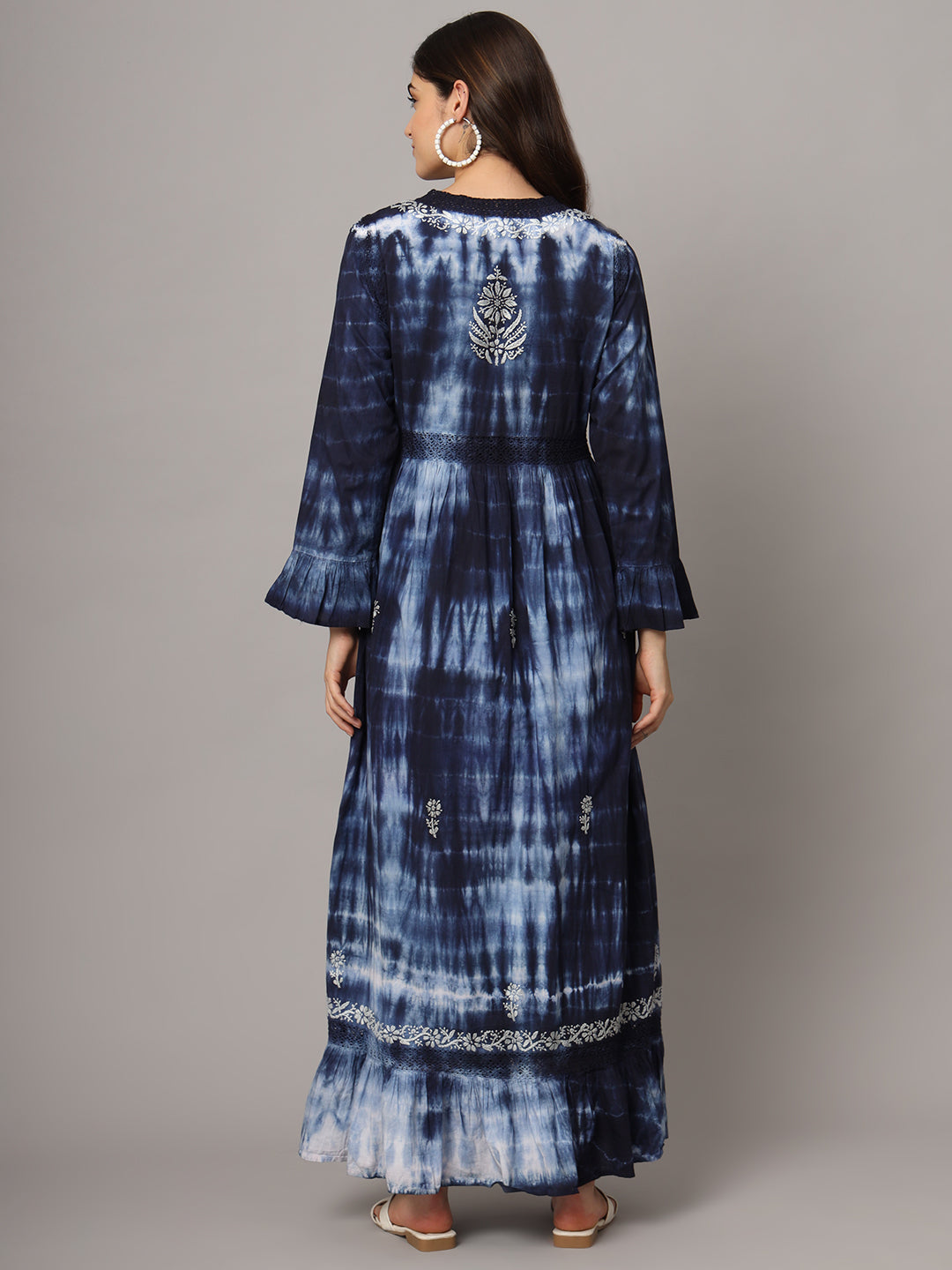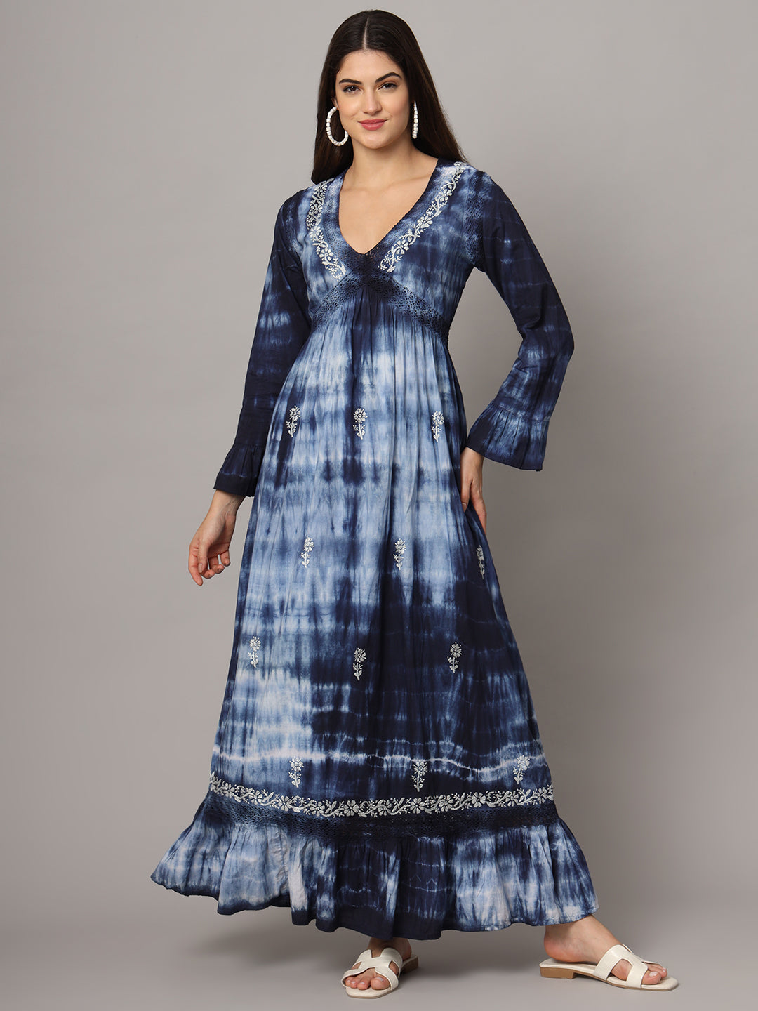 Women Chikankari Hand Embroidered Cotton Jalabiya in Tie-Dye shades-AL2160 Navy