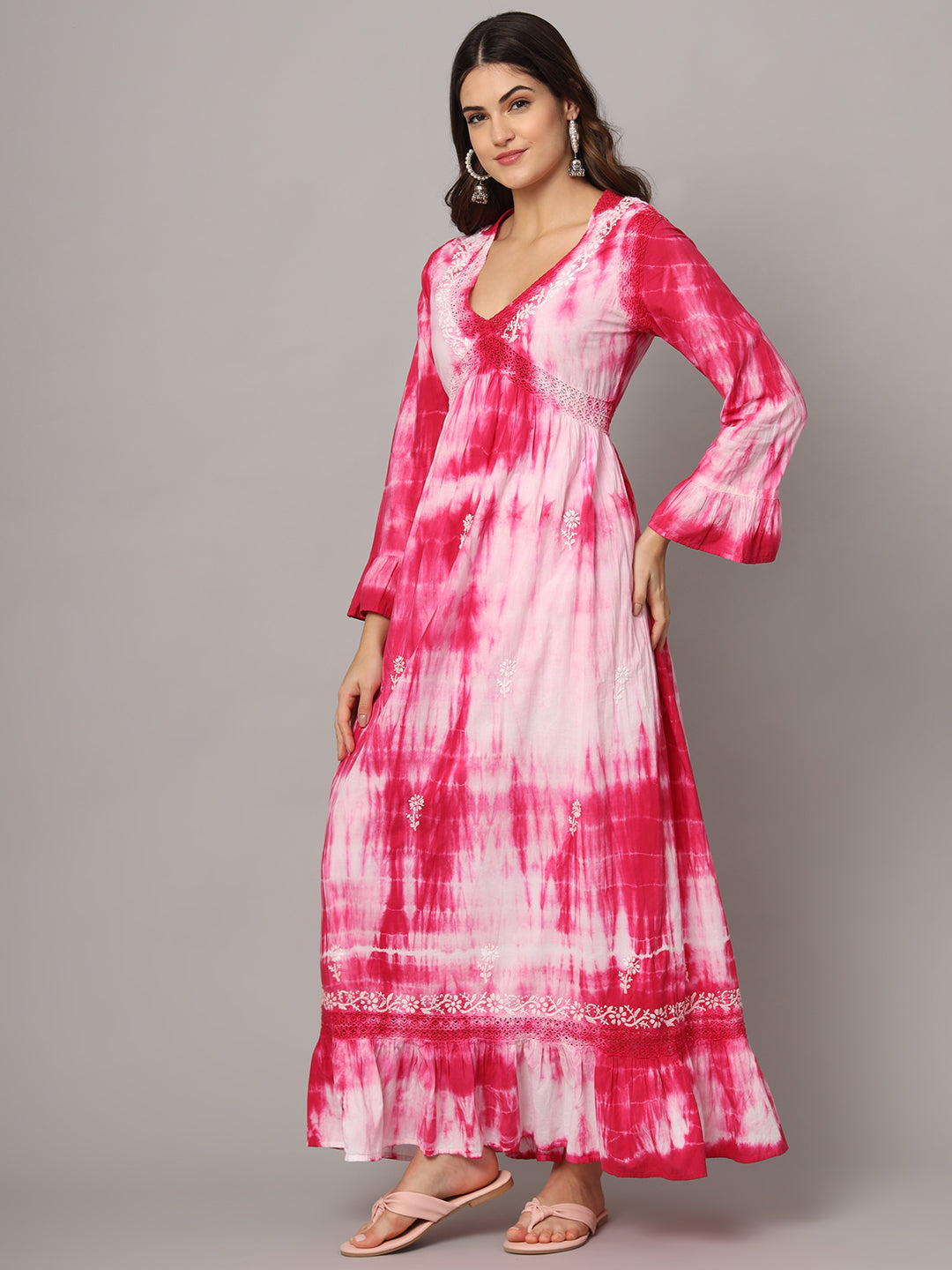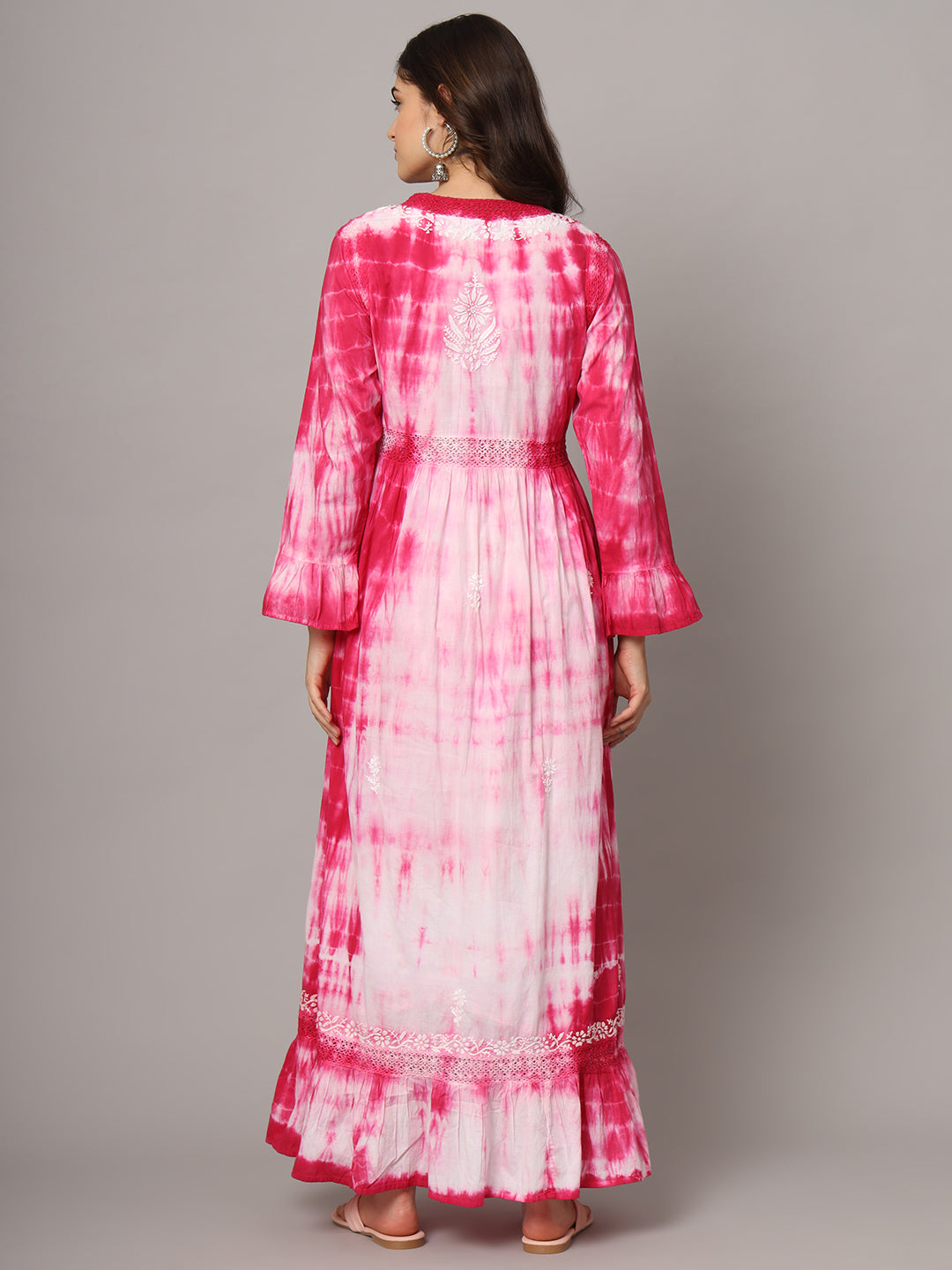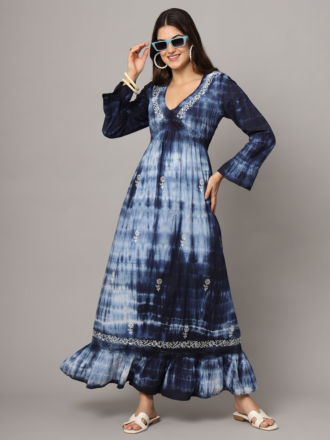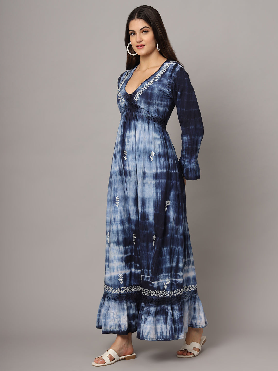 Women Chikankari Hand Embroidered Cotton Jalabiya in Tie-Dye shades-AL2160 Navy