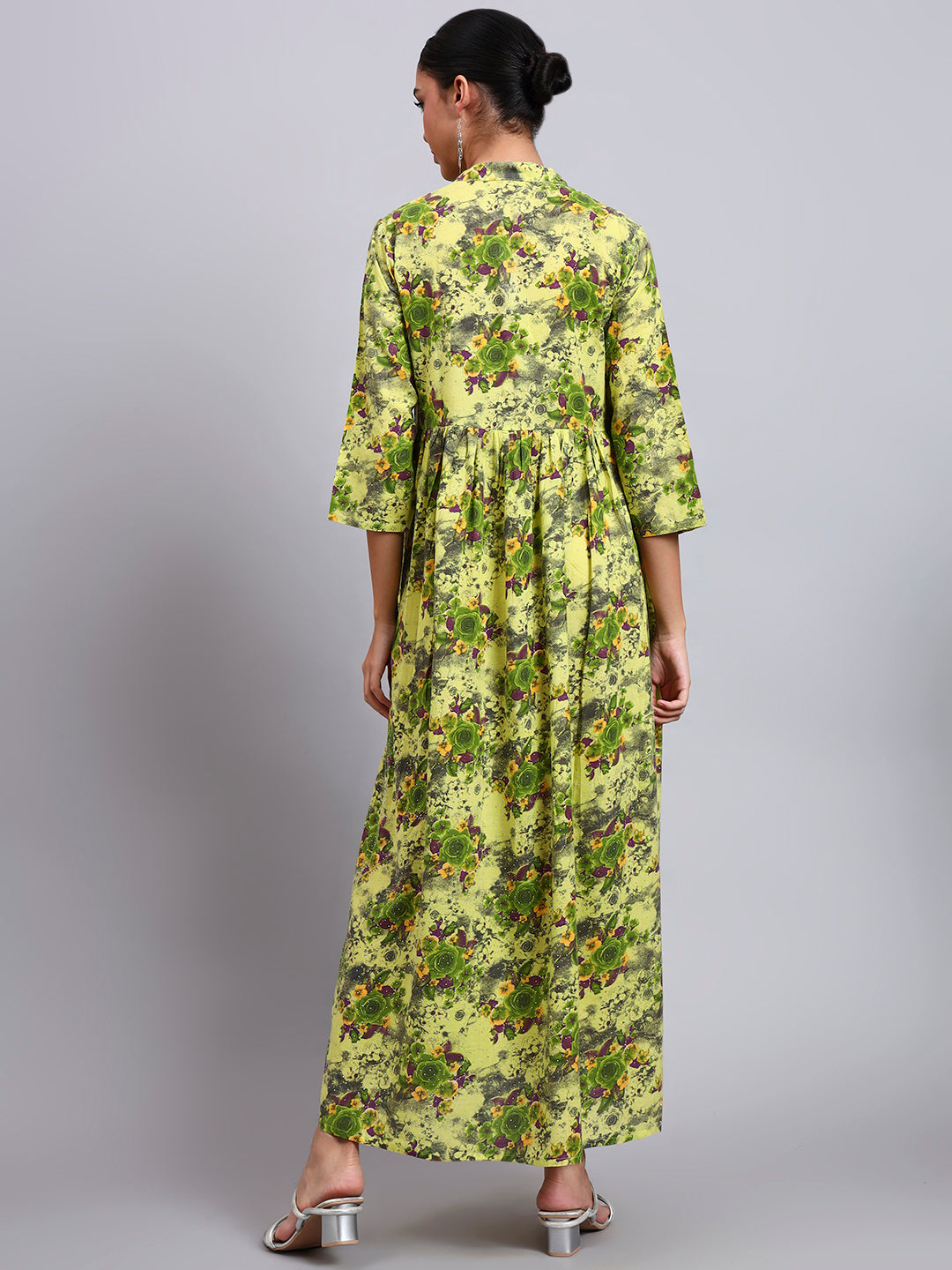 Step out in elegance with this floral printed cotton jalabiya. Designed with a graceful Mandarin collar, three-quarter sleeves, and a flattering gathered waist, it offers both style and comfort. Crafted from soft cotton fabric, this jalabiya features a maxi silhouette with a length of 54 inches, making it a versatile choice for casual outings, festive gatherings, or daily wear.