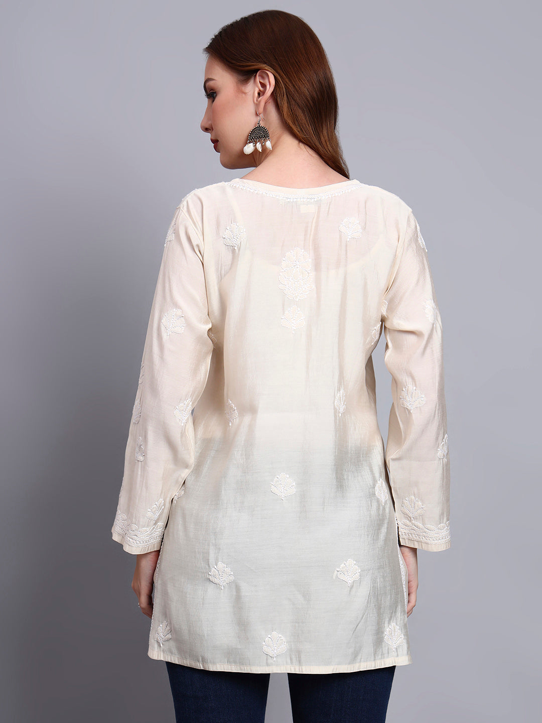 Women Hand Embroidered Chikankari Chanderi Short Kurti-AL4090 Beige