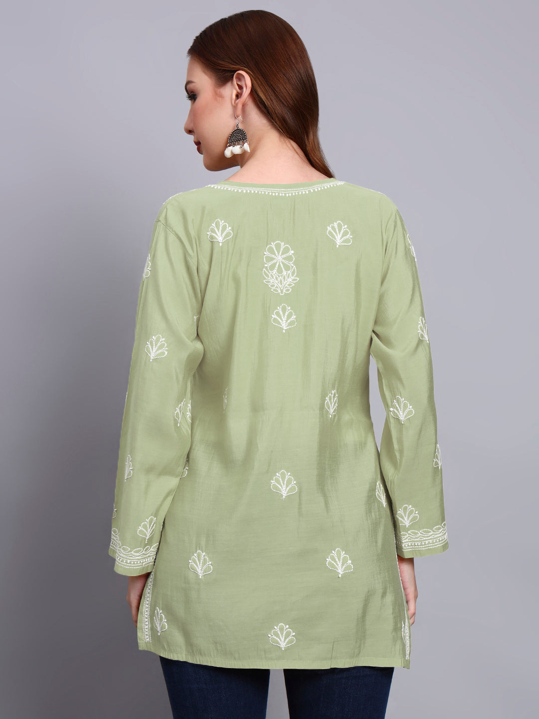 Women Hand Embroidered Chikankari Chanderi Short Kurti-AL4090 Green