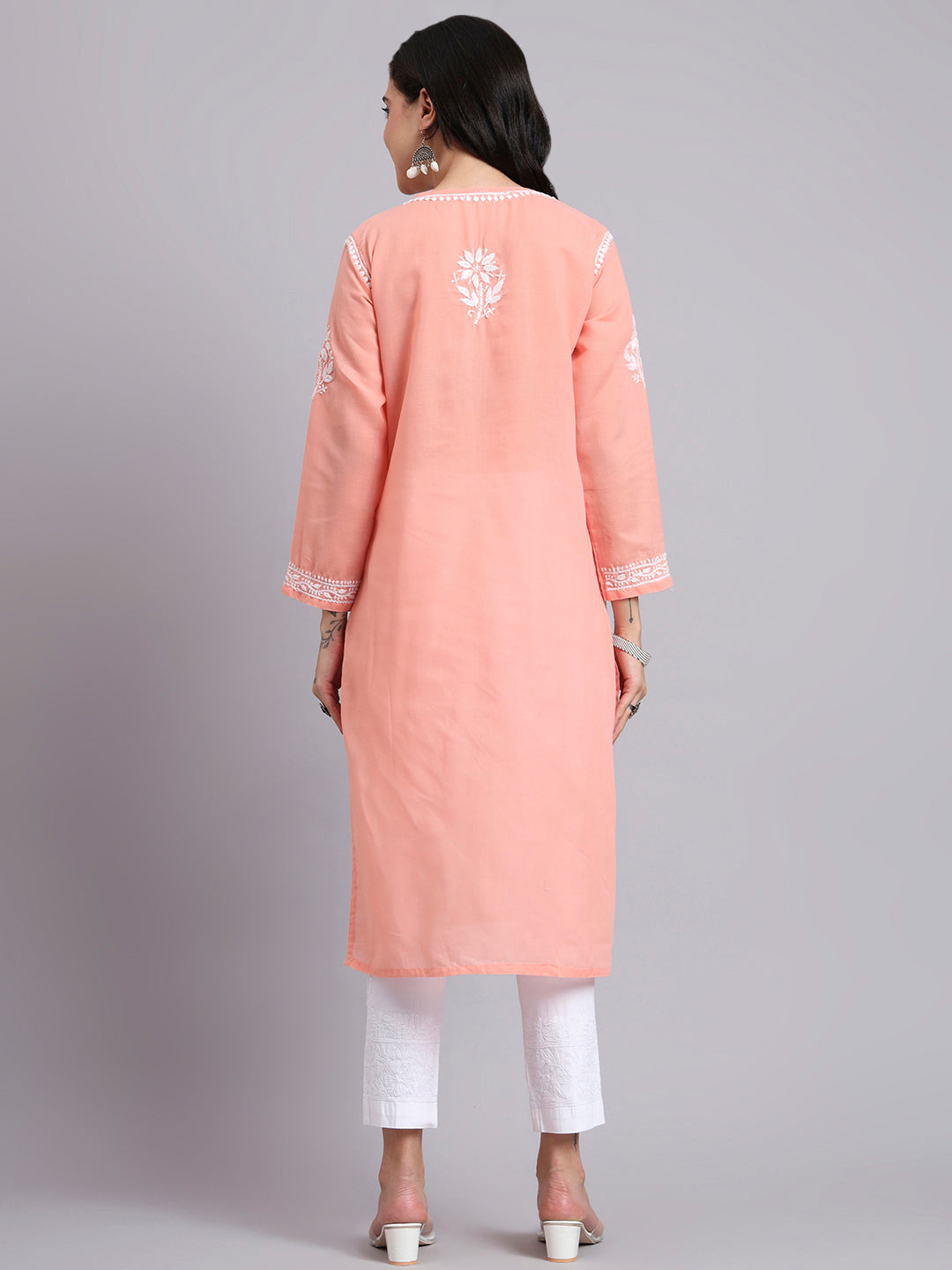 Women Hand Embroidered Chikankari Cotton Kurta-AL3999 Peach