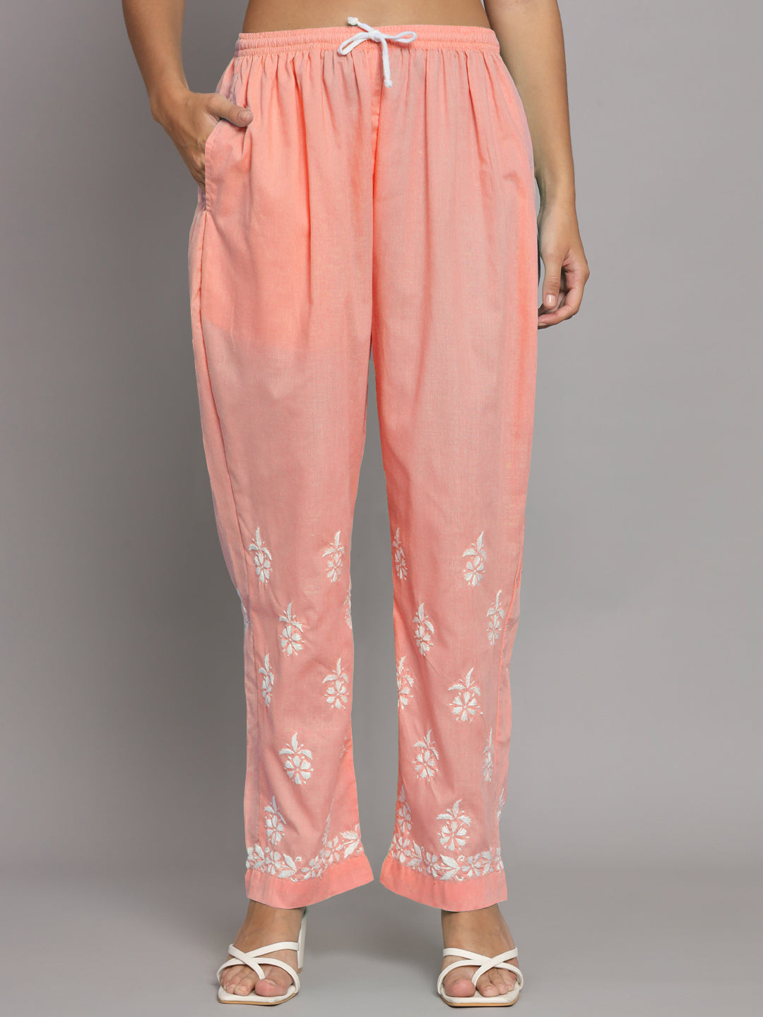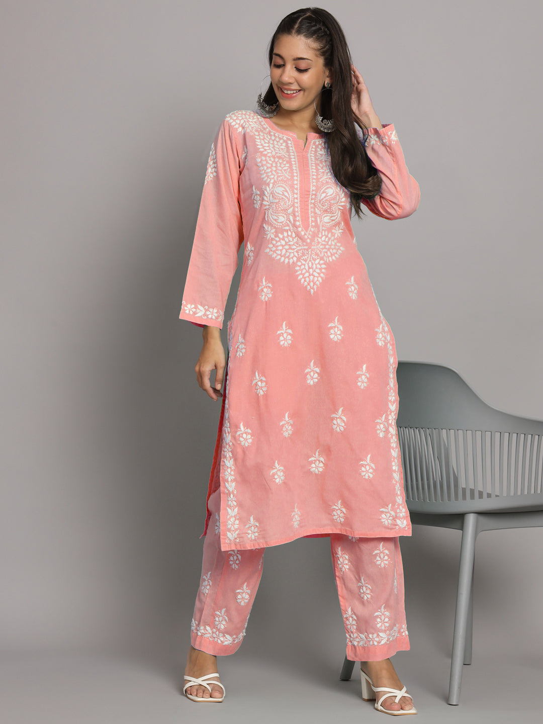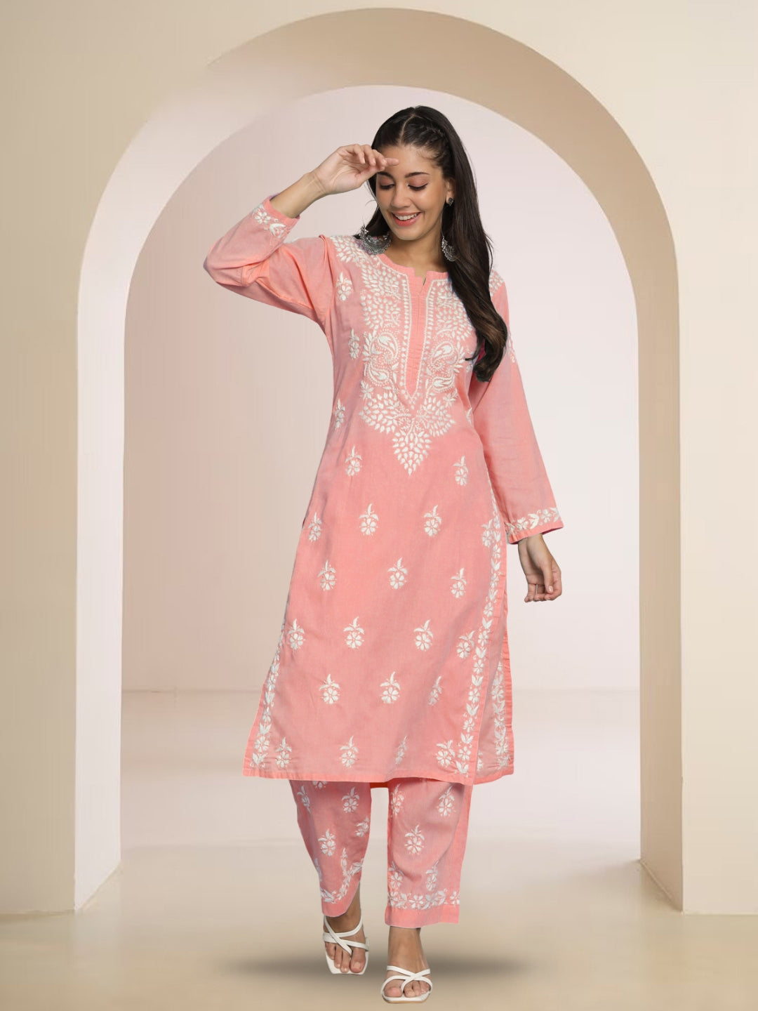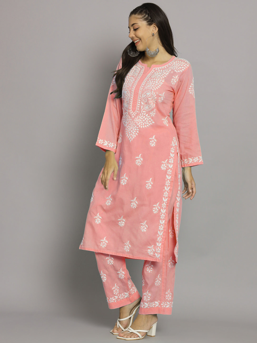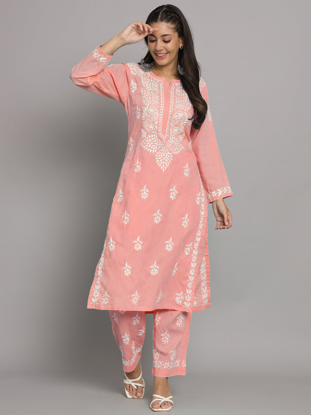 Women Hand Embroidered Chikankari Cotton Kurta Set Round Neck Three-Quarter Sleeve