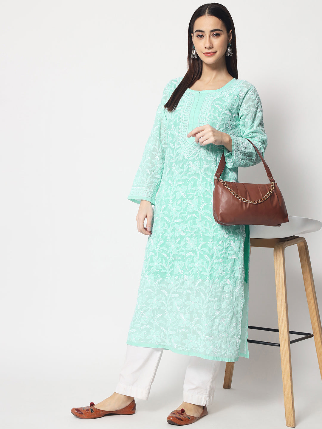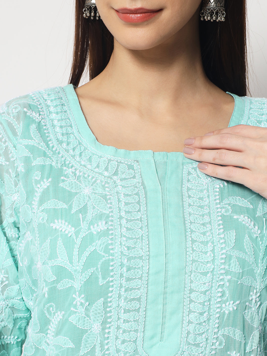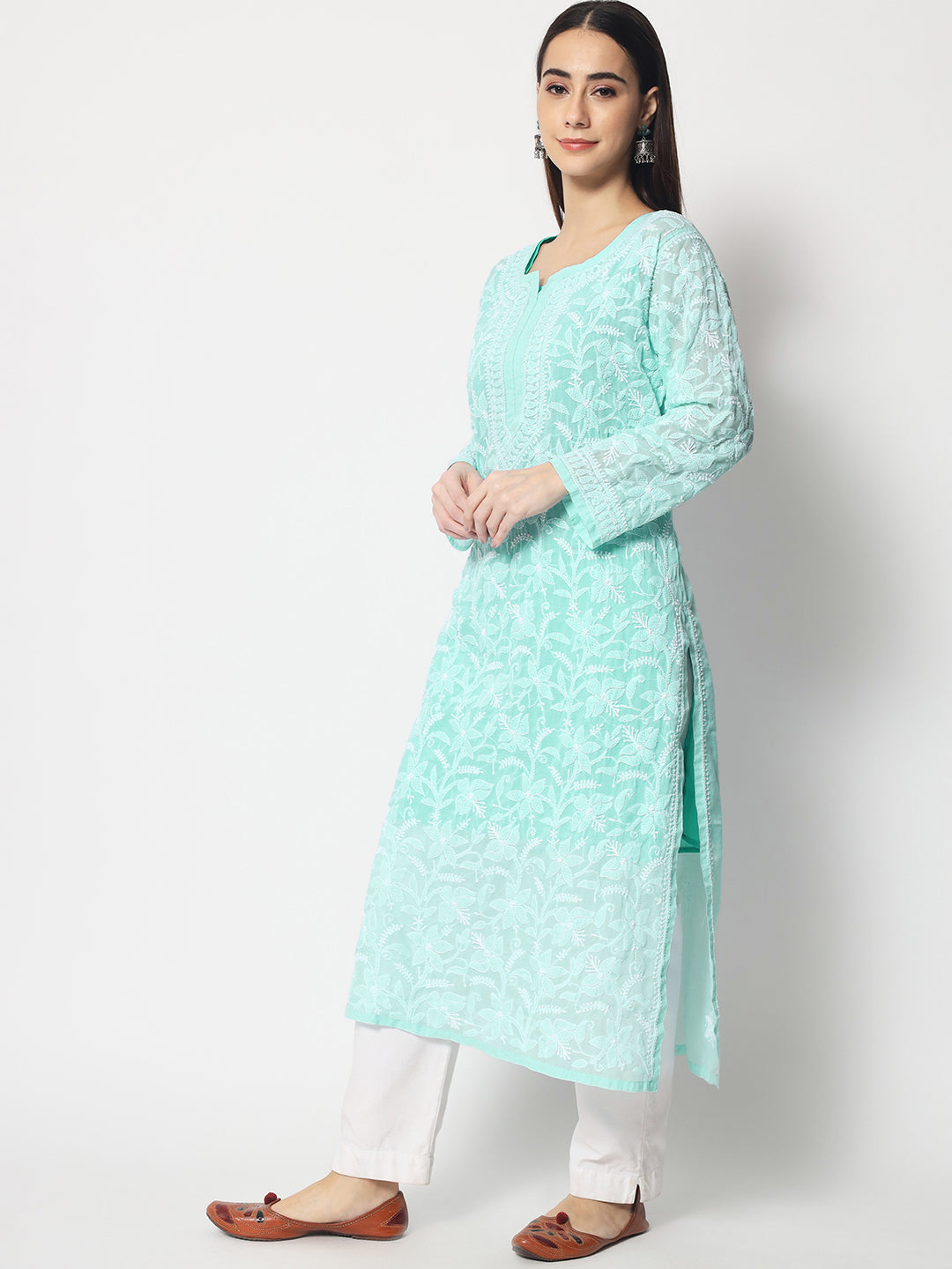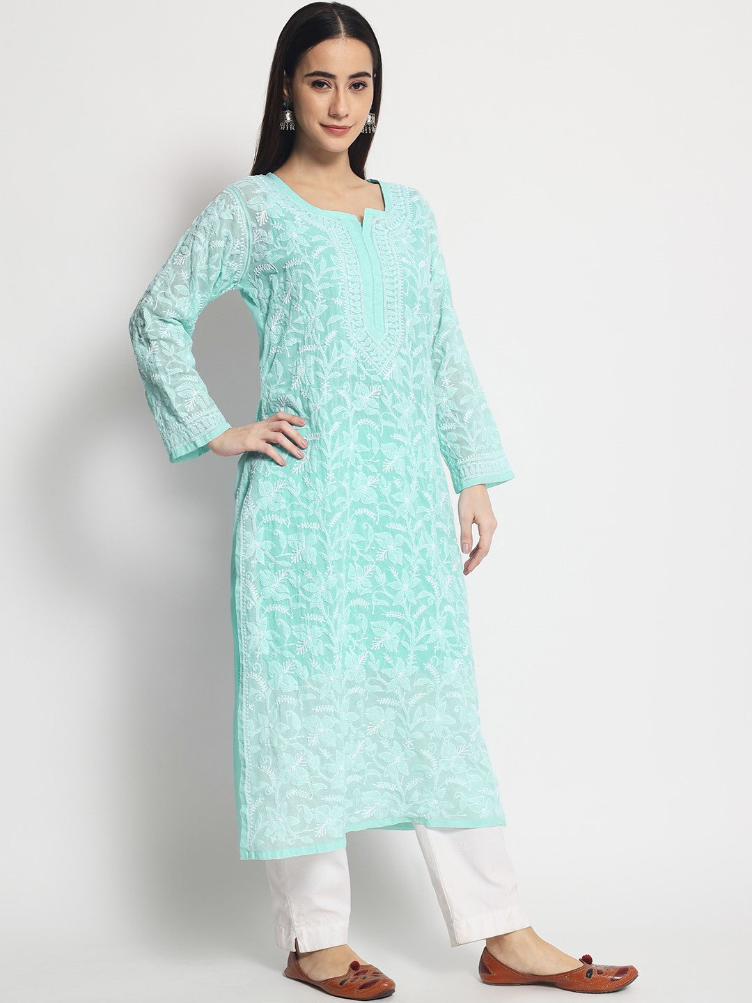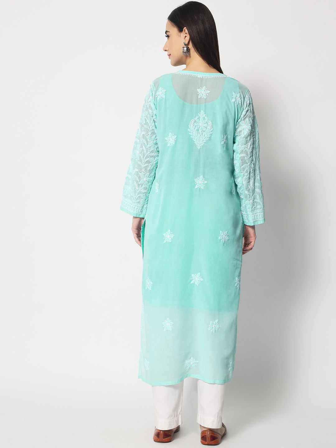 Hand Embroidered Cotton Chikankari kurta ,has a round neck, three-quarter Sleeves, embroidered detail,Chikankari Cotton