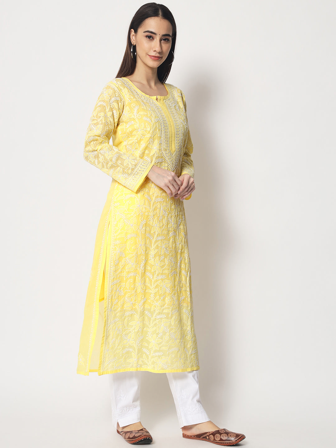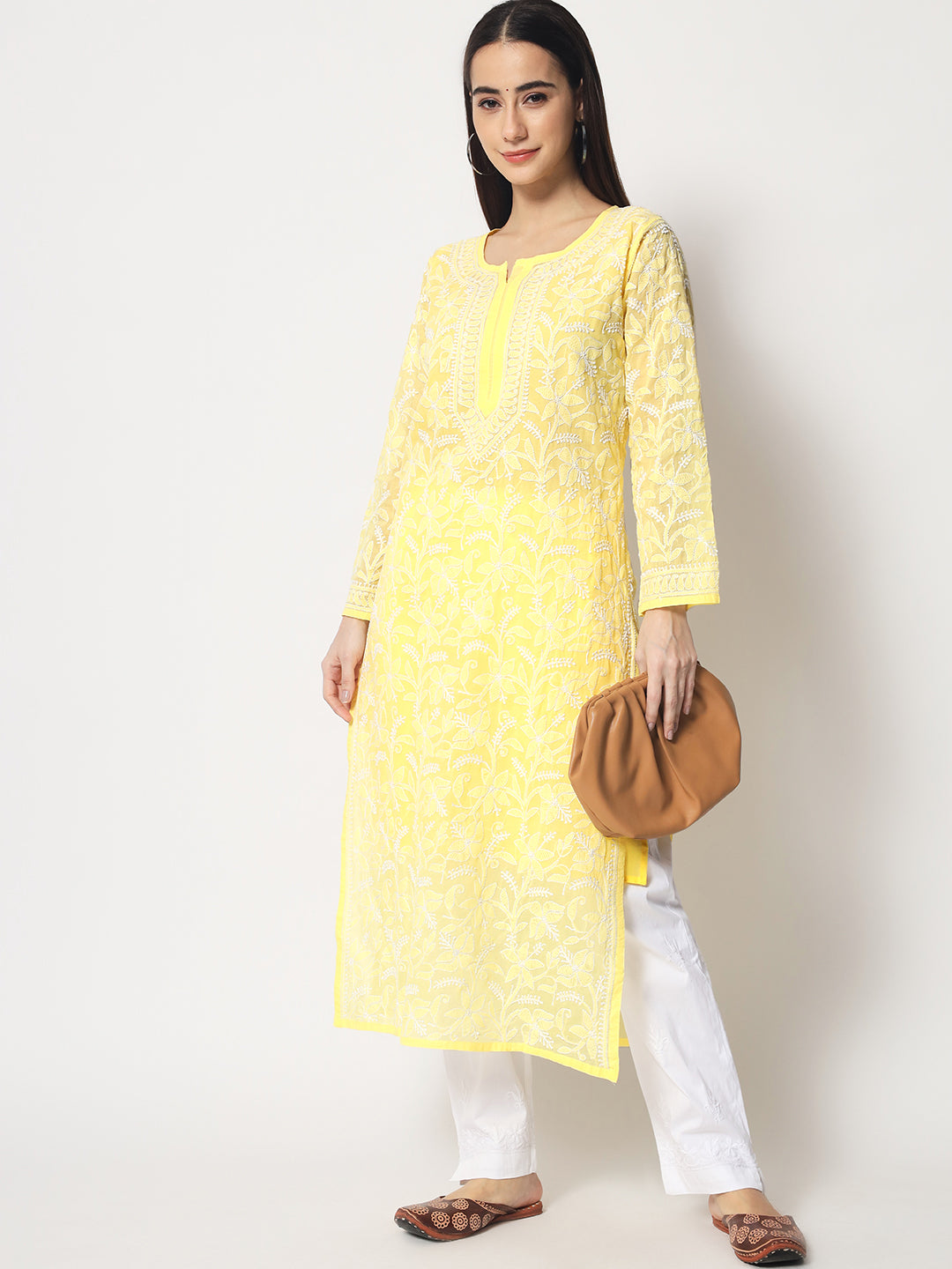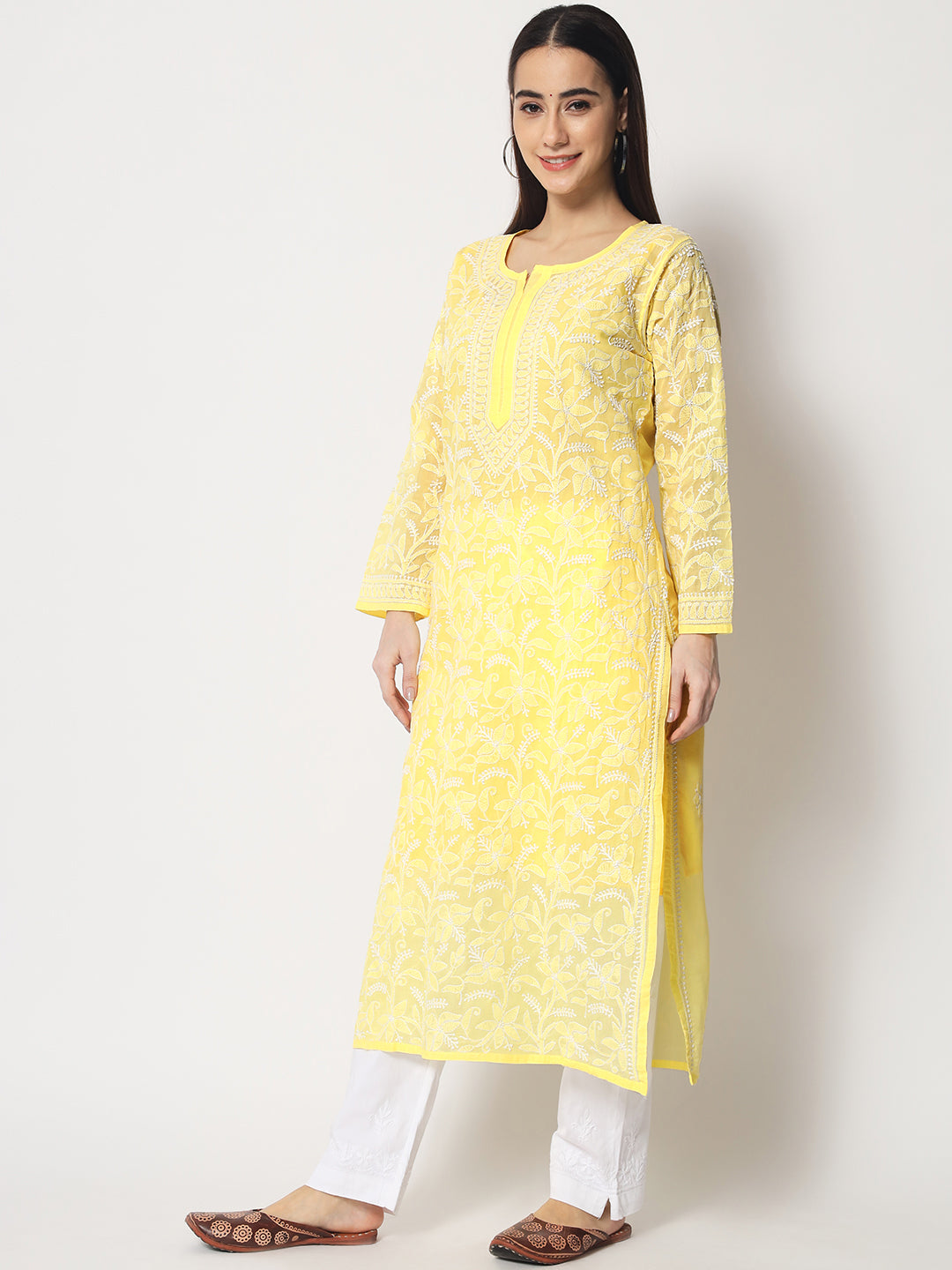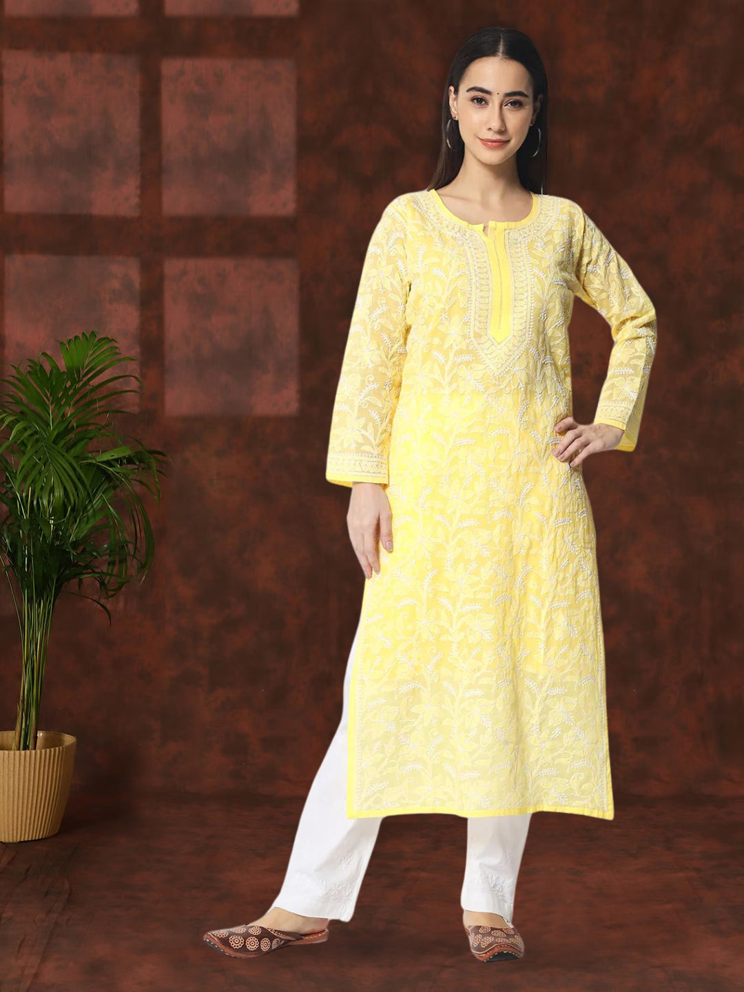 Women Hand Embroidered Chikankari Cotton Straight Kurta- AL3592 Mustard