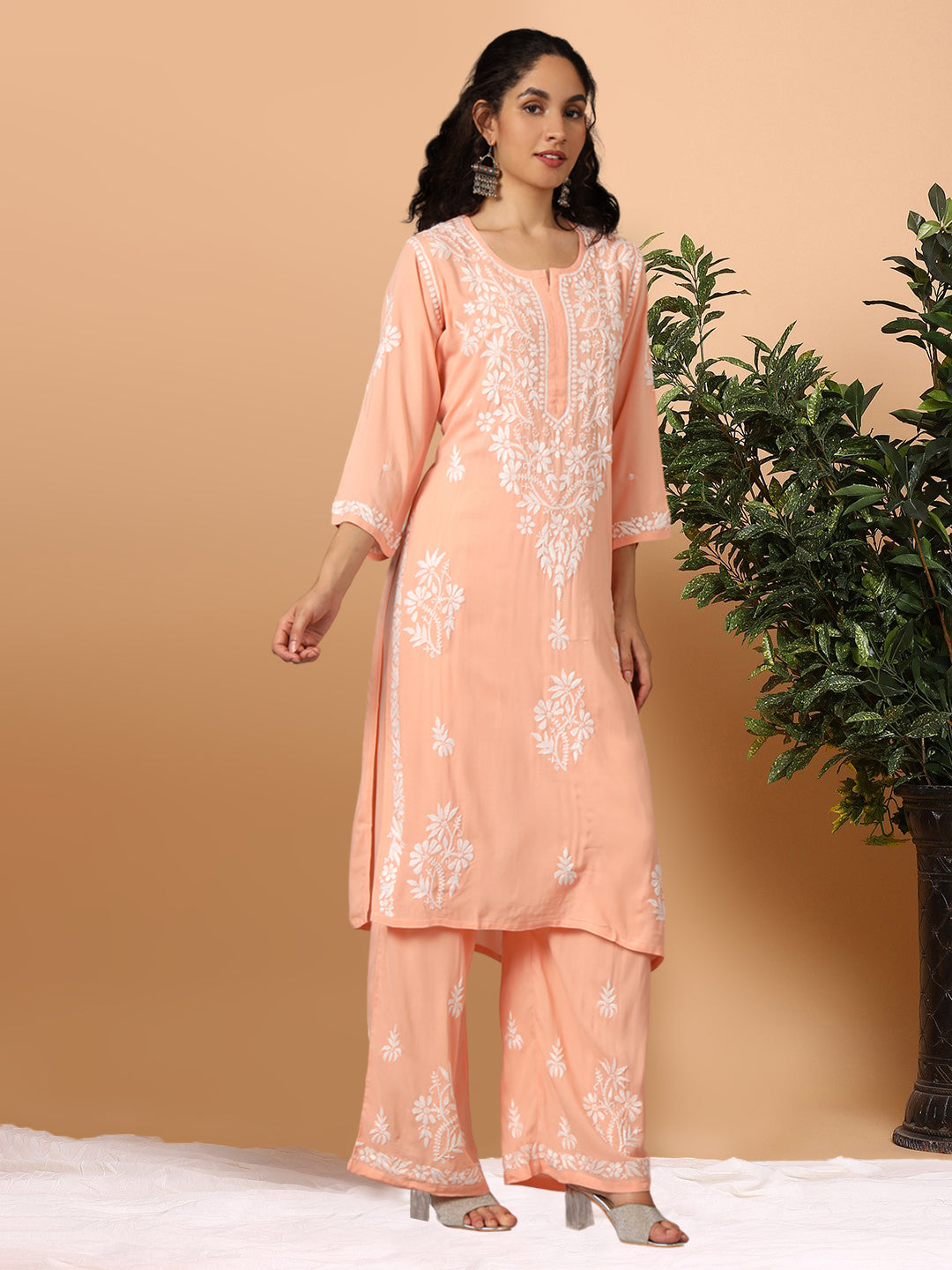 Women Hand Embroidered Chikankari Modal Kurta Set-AL3600KS Peach