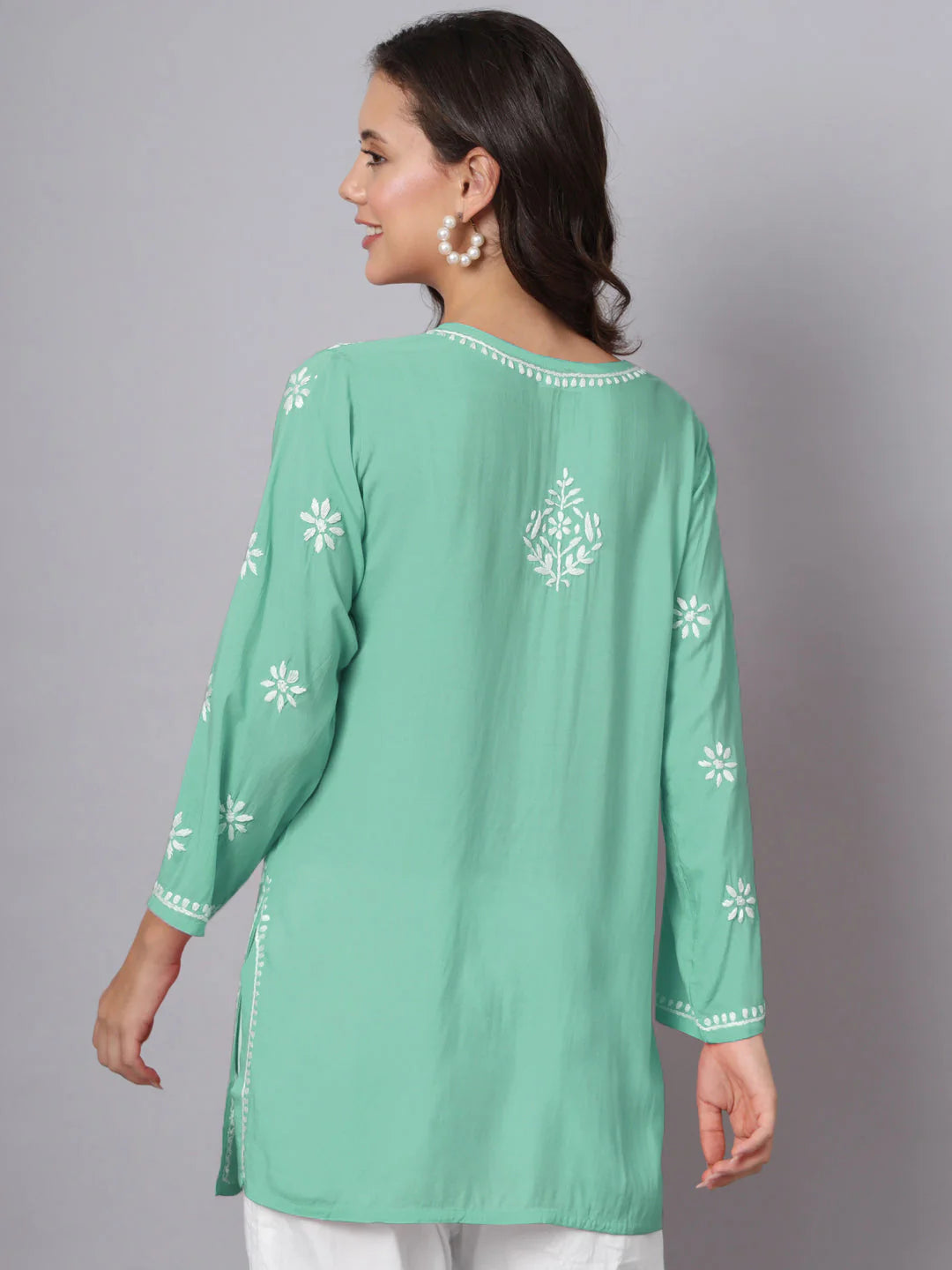 Hand Embroidered Modal Chikankari kurti ,has a round neck,three-quarter Sleeves, embroidered detail,Chikankari Modal
