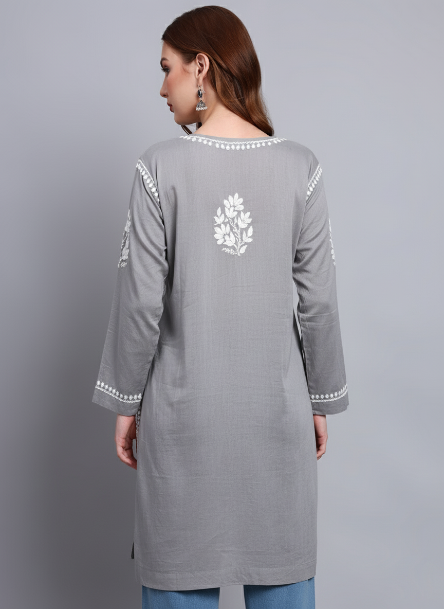 Women Hand Embroidered Chikankari Cotton Kurti -AL3685 Grey