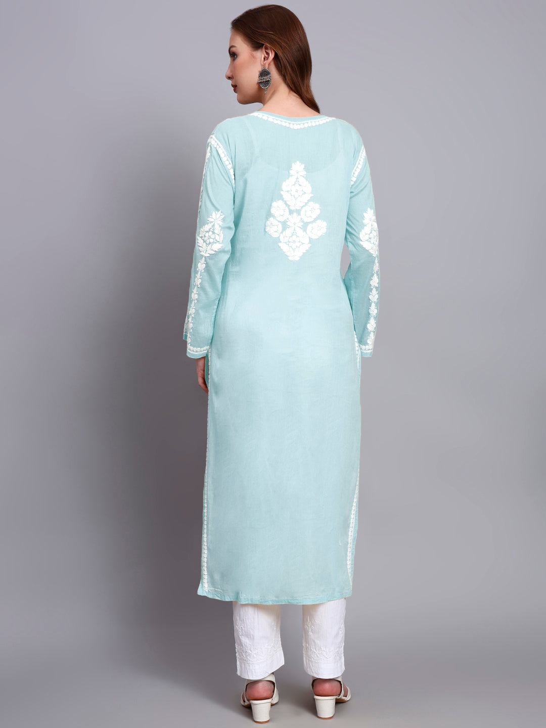 The Women’s Hand Embroidered Chikankari Mulmul Kurti features exquisite hand-stitched Chikankari embroidery, showcasing intricate floral designs. Made from soft, lightweight modal fabric, it drapes elegantly and ensures comfort. With a flattering silhouette, round neck, and three-quarter sleeves, this kurti is perfect for casual outings or festive occasions, blending traditional craftsmanship with modern style.
