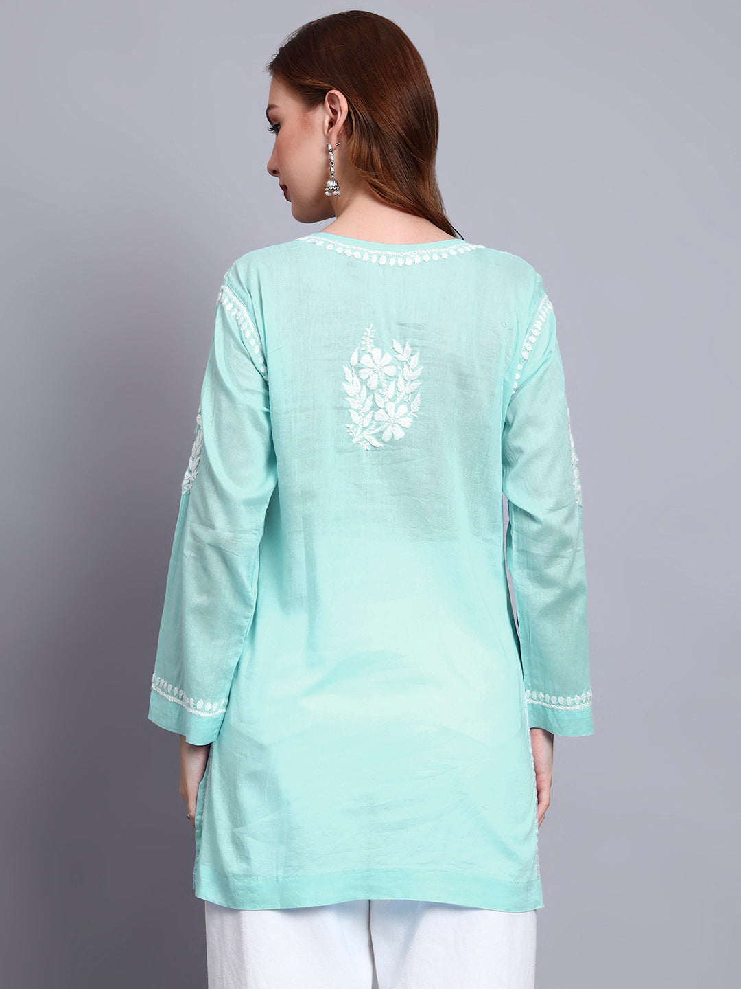 Women Hand Embroidered Chikankari Mulmul Short Top -AL3724 Seagreen