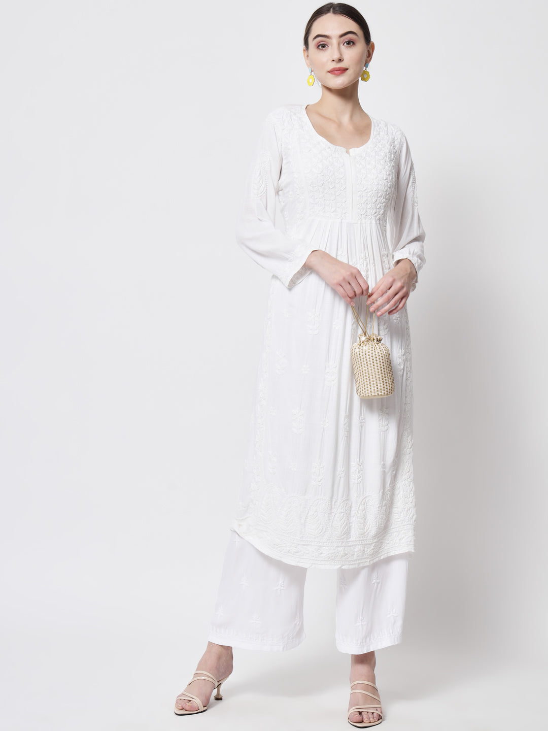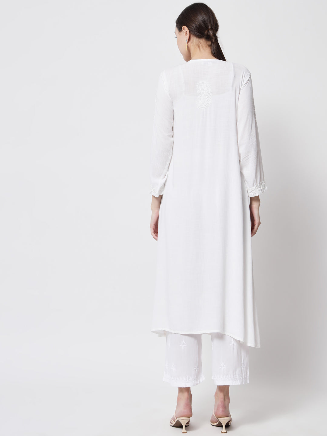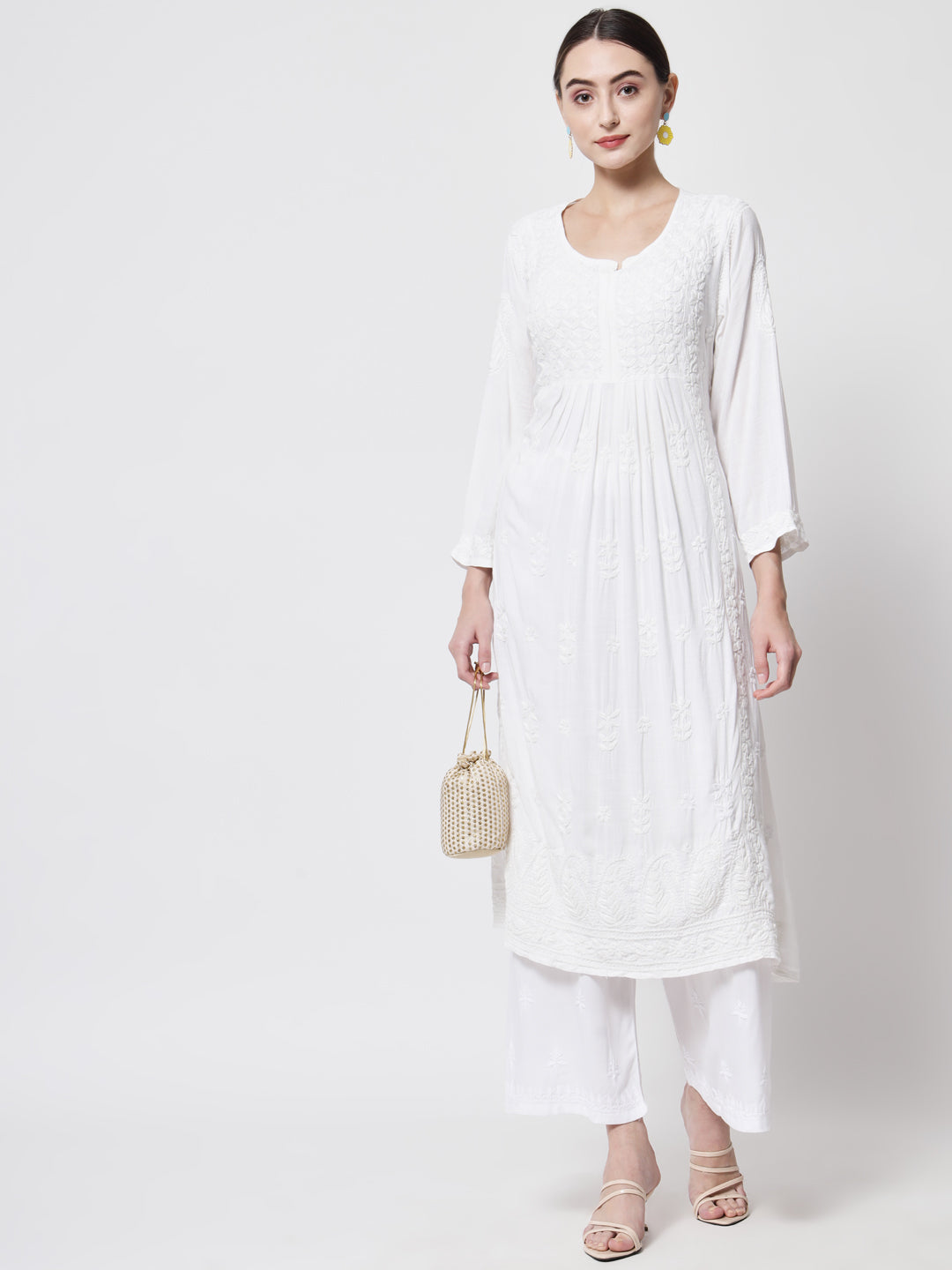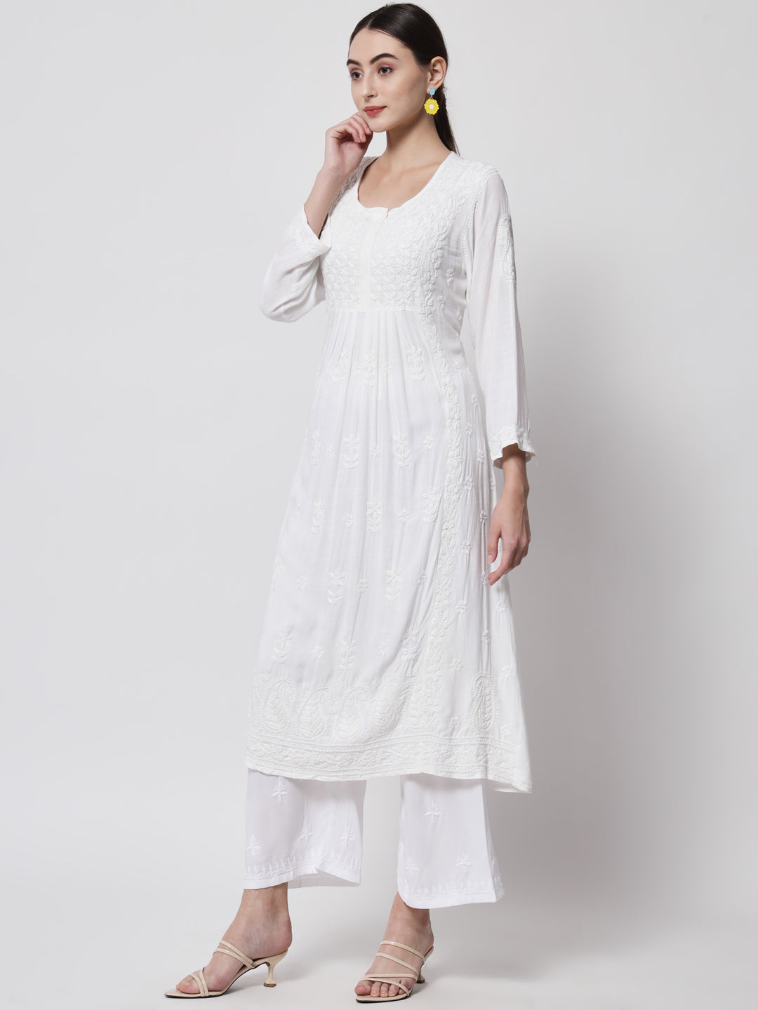 Women Hand Embroidered Chikankari Rayon Kurta-AL3549 White