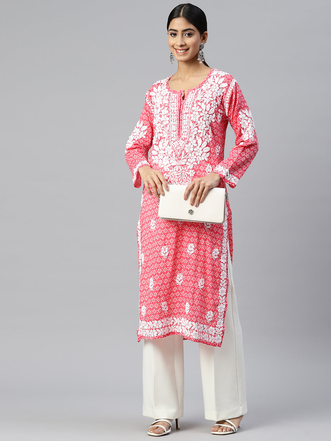 Women Hand Embroidered Lucknowi Chikankari Mulmul Cotton Kurta - AL3650 Pink