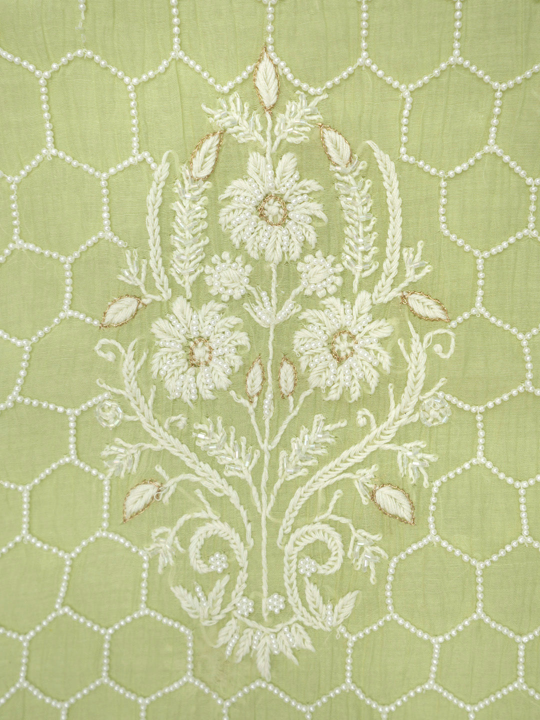 The hand-embroidered Chikankari work, stitched in tonal Mint threads, features classic techniques like Phanda, Pechni, Bakhiya, and Ghaspatti. Each detail is a tribute to intricate artistry, imparting a soft, dreamlike beauty to the fabric. The meticulous embroidery enriches the fabric’s natural allure, keeping alive the storied tradition of Lucknowi handwork.