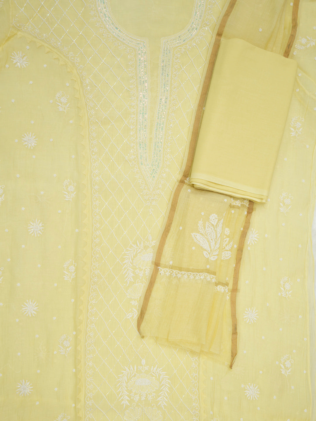 Women Hand Embroidered Premium Chikankari Mul Chanderi Unstitched Kurta Dupatta Bottom Set-ALSCA85201FS Yellow